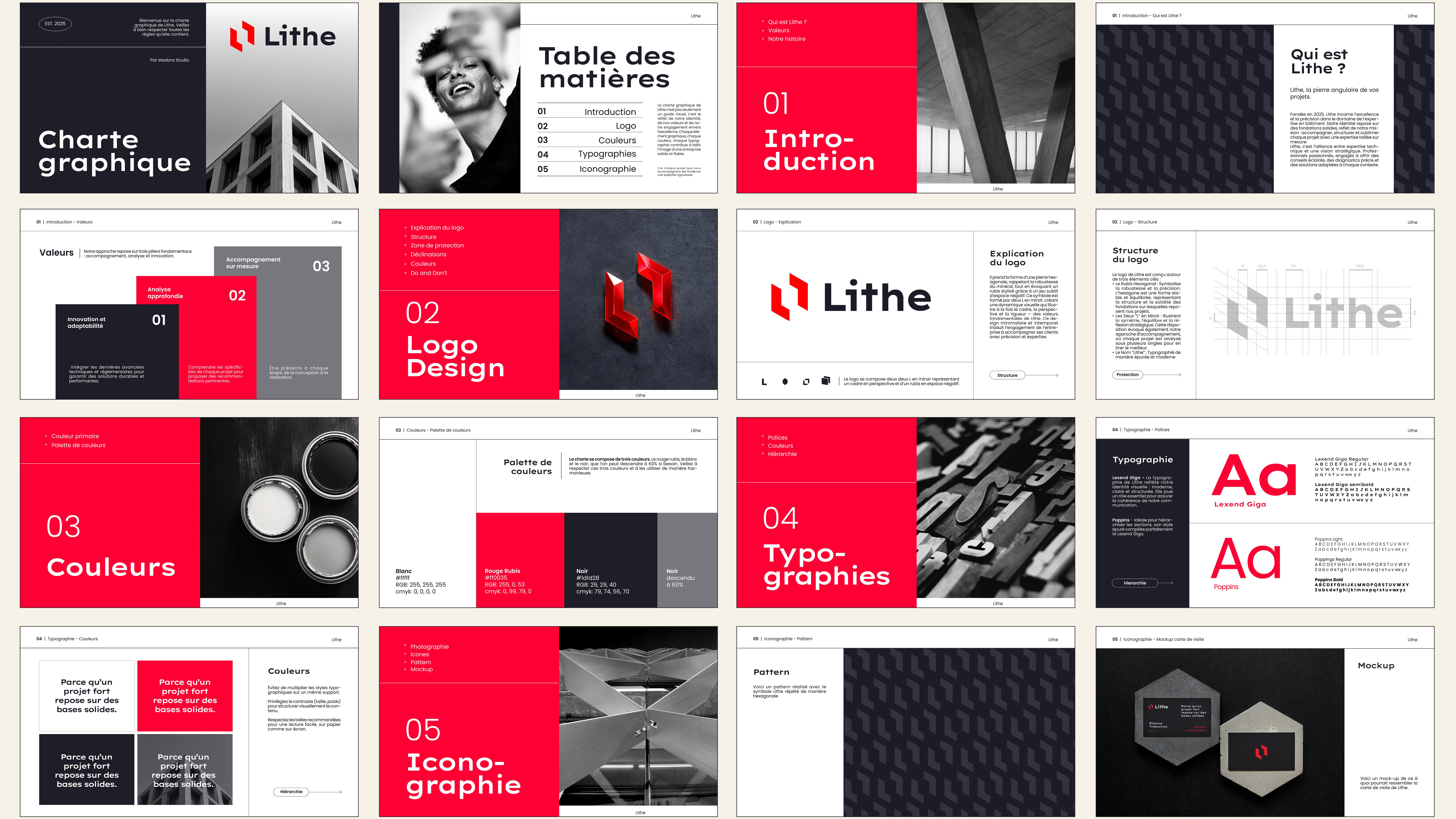 Le logo que j’ai créé prend la forme d’une pierre hexagonale, rappelant la robustesse du minéral, tout en évoquant un rubis stylisé grâce à un jeu subtil d’espace négatif. Ce symbole est formé par deux L en miroir, créant une dynamique visuelle qui illustre à la fois le cadre, la perspective et la rigueur — des valeurs fondamentales de Lithe. Ce design minimaliste et intemporel traduit l’engagement de l’entreprise à accompagner ses clients avec précision et expertise.